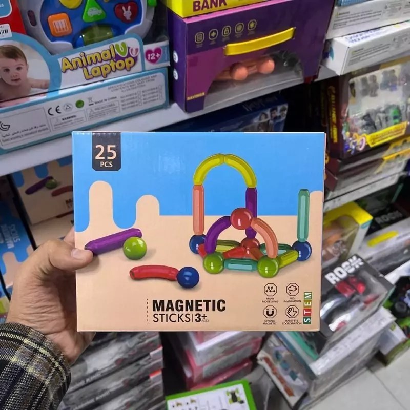 اسباببازی مگنت میله و مهرهای ۲۵ قطعه یکی از محبوبترین بازیهای آموزشی برای کودکان بالای ۳ سال است. این مجموعه شامل میلهها و گویهای مغناطیسی است که بهوسیله خاصیت آهنربایی بهراحتی به هم متصل میشوند و کودک میتواند با آنها سازههای متنوعی مثل حیوانات، اشکال هندسی و مدلهای خلاقانه بسازد.